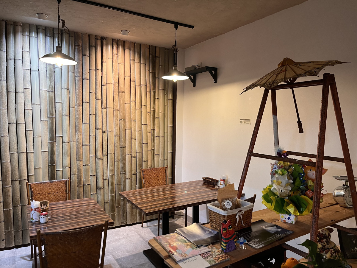 竹をあしらった壁面が印象的な店内