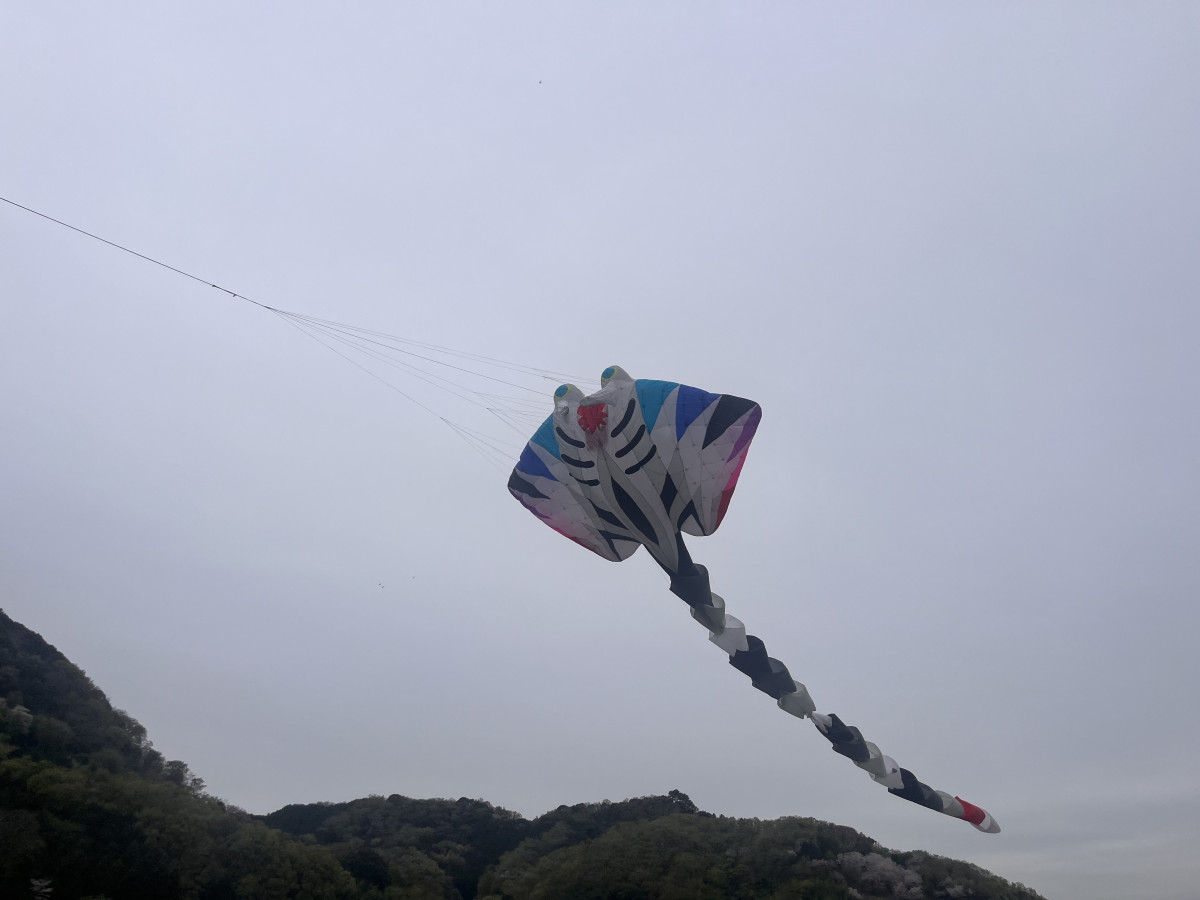 狩野川河川敷の上空を泳ぐマンタ形のカイト