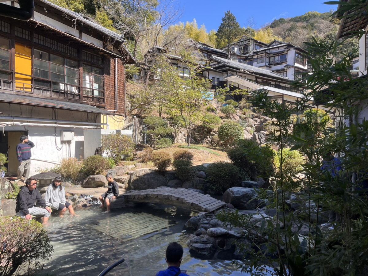 南山荘の庭で足湯を楽しむ来場者